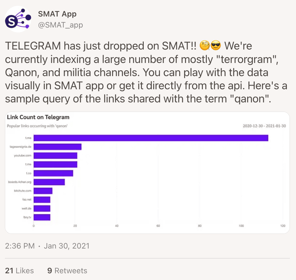 Open Measures has now added Telegram data to its datasets, with more than 8.8 million posts crawled from 1000 channels.