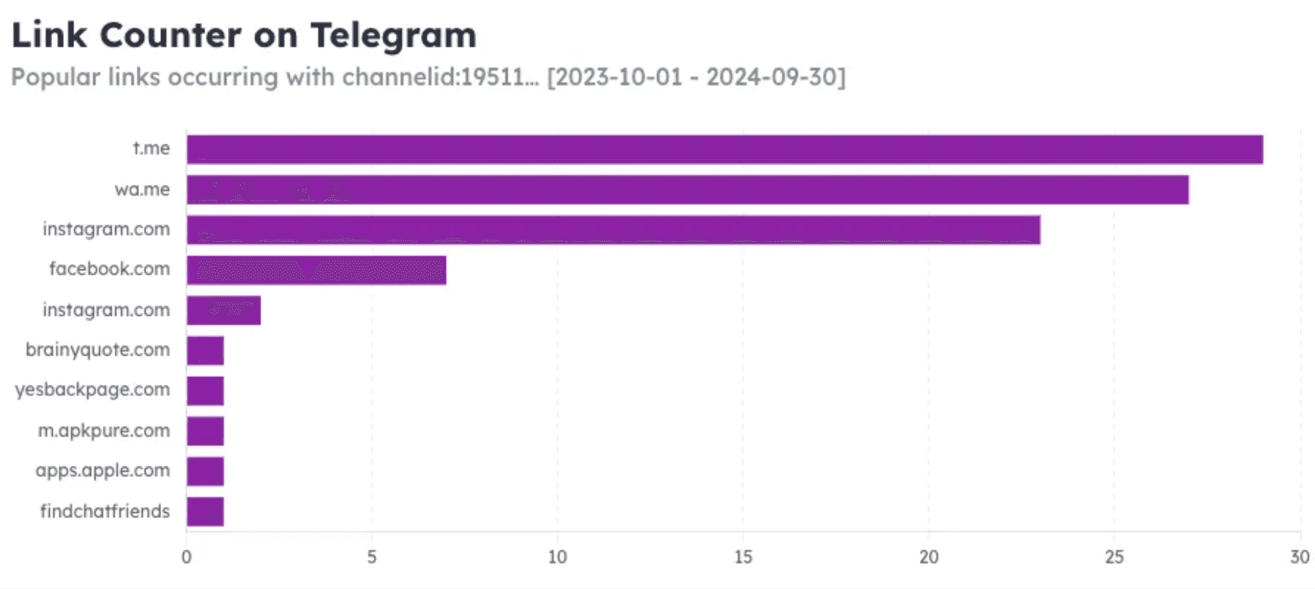 Our researchers used the Link Counter tool – which provides information on which domains are being shared on various platforms in Open Measures data – to examine Yahoo-related channels that had thousands of followers. To narrow the scope of our investigation, we used the Link Counter’s “Advanced” search feature to target specific Telegram channels from Oct. 1, 2023 to Sept. 30, 2024.